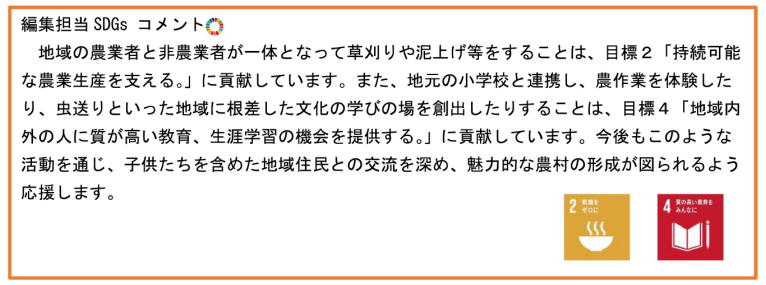 農業者と非農業者が一体になって、農道の草刈りや水路の泥上げなどを実施しています!また、地元の小学生と田植えを行うなど、地域に根付いた活動も行っています!