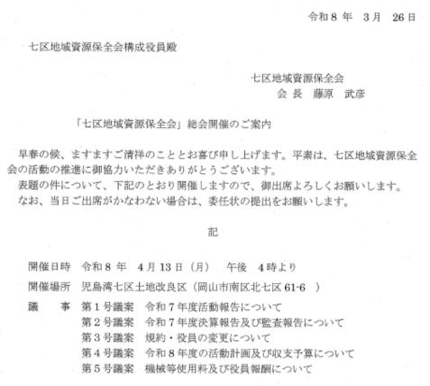 〇「七区地域資源保全会」総会開催のご案内