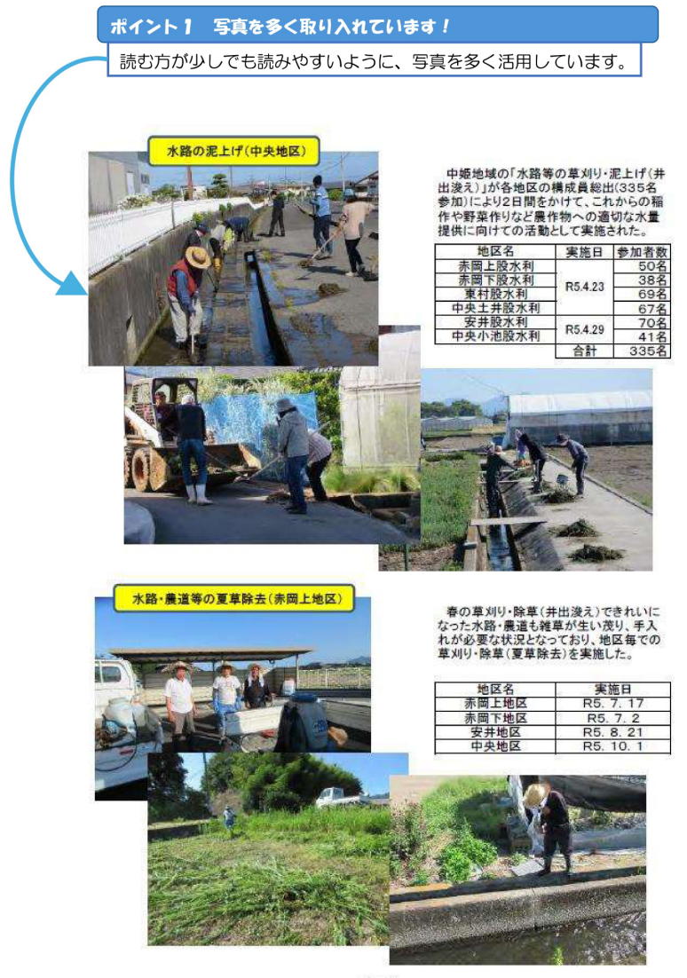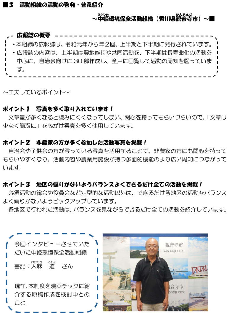 年2回、広報誌を作成し、活動の周知を図っています!自治会や子供会の方が写っている写真を活用することで、非農家の方にも関心を持ってもらえるようにしています!
